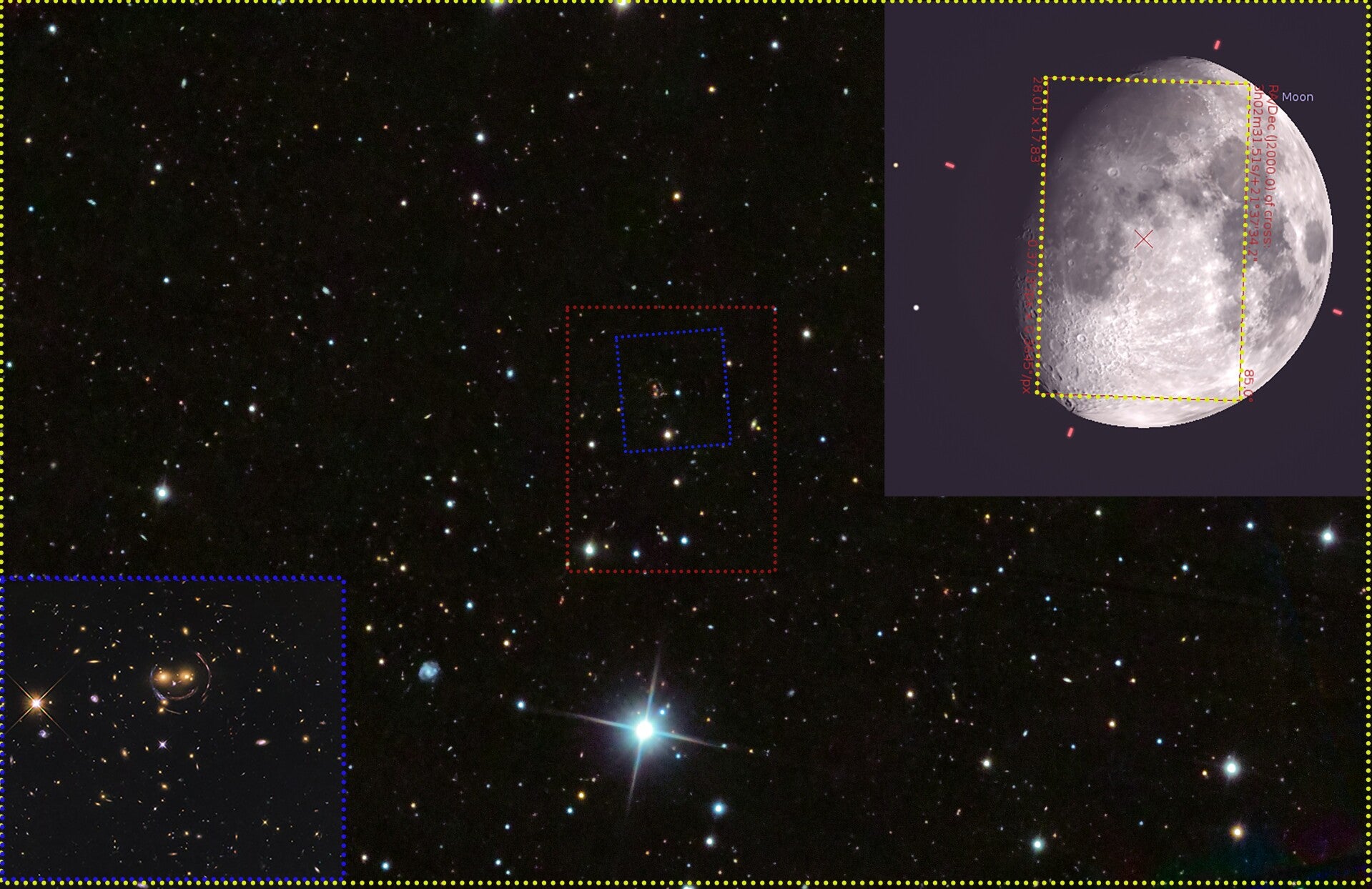 • galaxia „lentilă” (foreground) este o Luminous Red Galaxy extrem de masivă, la z ≈ 0,44 (aprox. 4,5 miliarde ani lumina), iar sursa din fundal este o galaxie cu formare stelară la z ≈ 2,38 (aprox. 11 miliarde ani lumina).